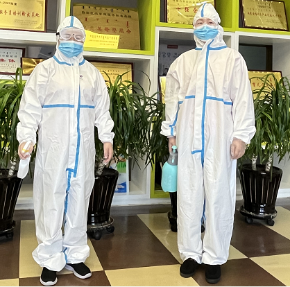 晨檢工作從“七步洗手法”開始,清潔雙手后再次使用酒精進行手部消殺,戴好口罩,穿戴好防護服等一系列防護裝備迎檢教職工。
